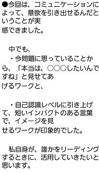 今まで学んだ応用編をツールに、問題解決、目標設定を学んだところで自由に使うことを目指します。また すでに学んでいる方と初めて学ぶ方が一緒にコミュニケーションを学ぶ事は、すでに学んでいる方は、どんな言葉かけをすれば、相手の意欲を引き出せるコミュニケーションがとれるか等。初めての方は 自分が学ぶ事によって、どのように一致した姿になれるかなど 先輩の姿を見て自分の未来を見る事ができる等 お互いの学びの場として有意義な時間を作る事ができます。